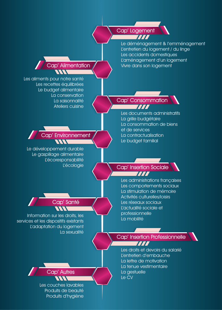 Ces ateliers sont sur les thèmes de la vie quotidienne (logement, consommation, alimentation, insertion professionnelle, insertion sociale, santé, environnement…).